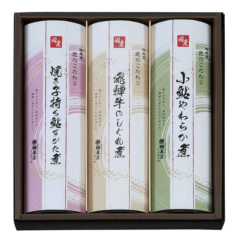 (焼き子持ち鮎すがた煮、飛騨牛のしぐれ煮、小鮎やわらか煮 詰め合わせ)