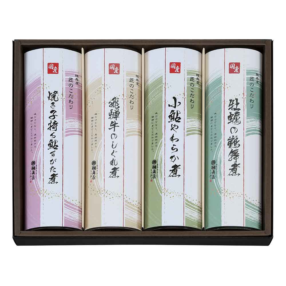 (焼き子持ち鮎すがた煮、飛騨牛のしぐれ煮、小鮎やわらか煮、牡蠣の鵜舞煮 詰め合わせ)