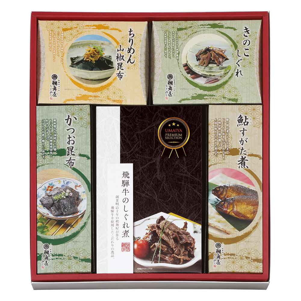 (きのこしぐれ、飛騨牛のしぐれ煮、かつお昆布、ちりめん山椒昆布、鮎すがた煮詰め合わせ)