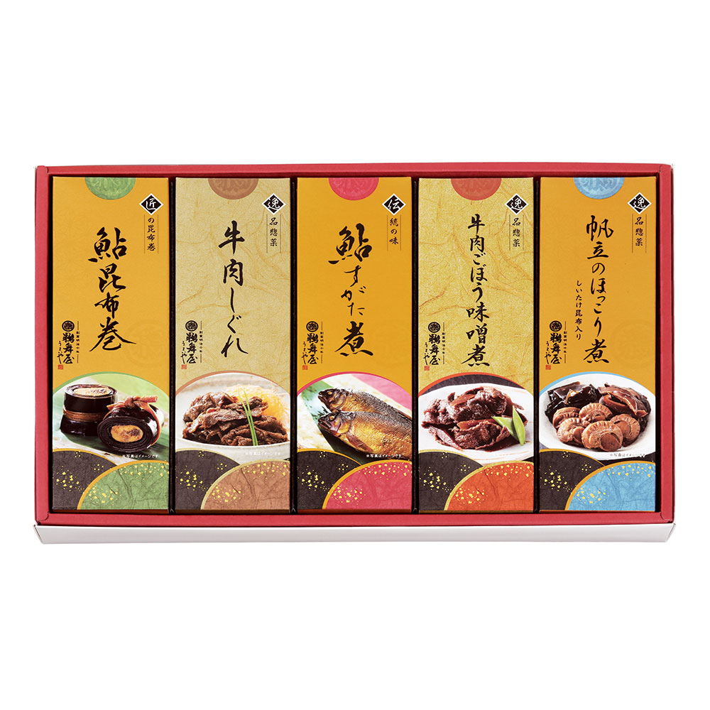 (鮎昆布巻、牛肉しぐれ、帆立のほっこり煮、鮎すがた煮、牛肉ごぼう味噌煮)